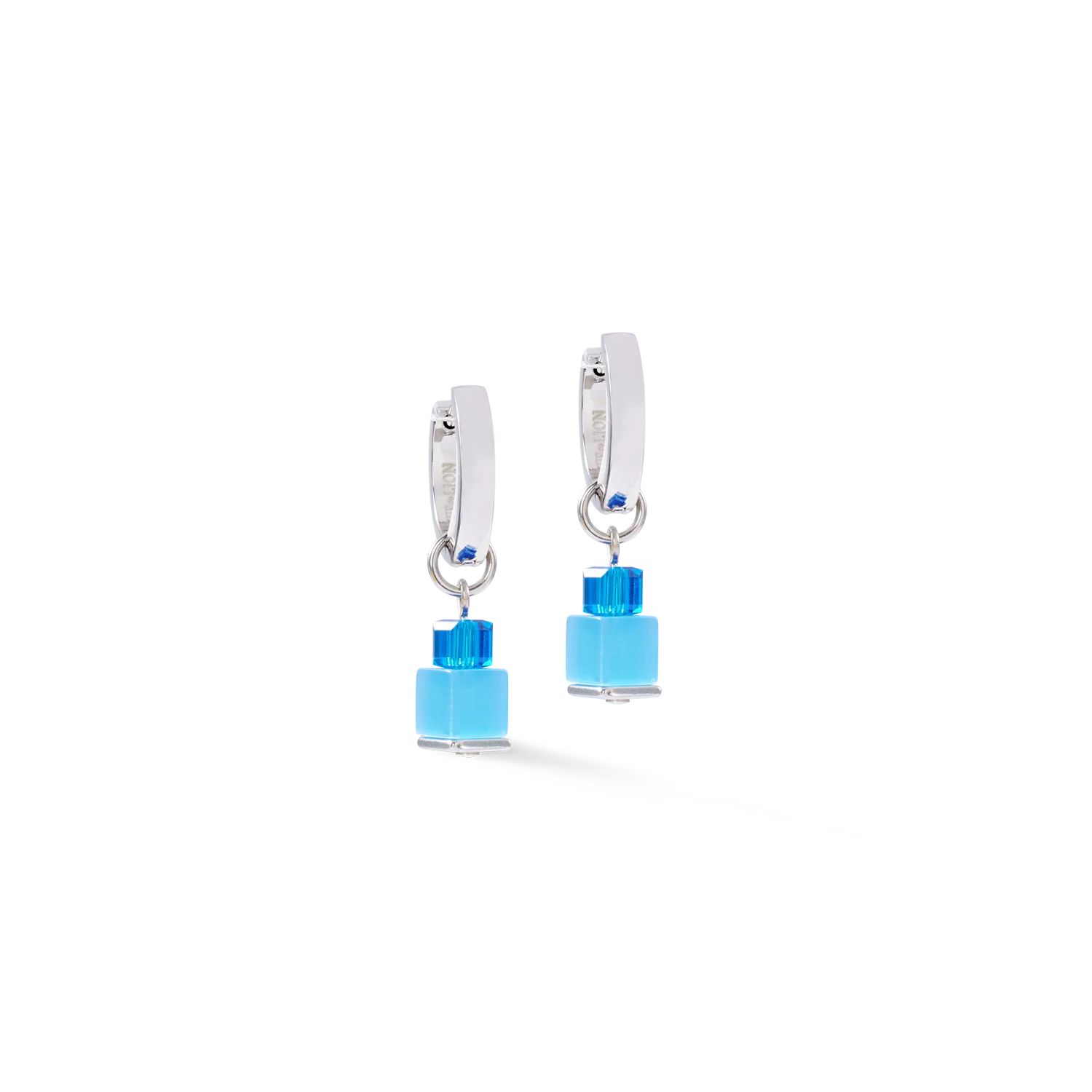 Minimalist but with character - the Creole Cube Fusion Charm Silver-Ocean earrings combine Swarovski® cubes, opaque and clear glass cubes and cool stainless steel in silver. The removable charms can be worn in different ways - as plain hoops or with the geometric elements for a more striking look.